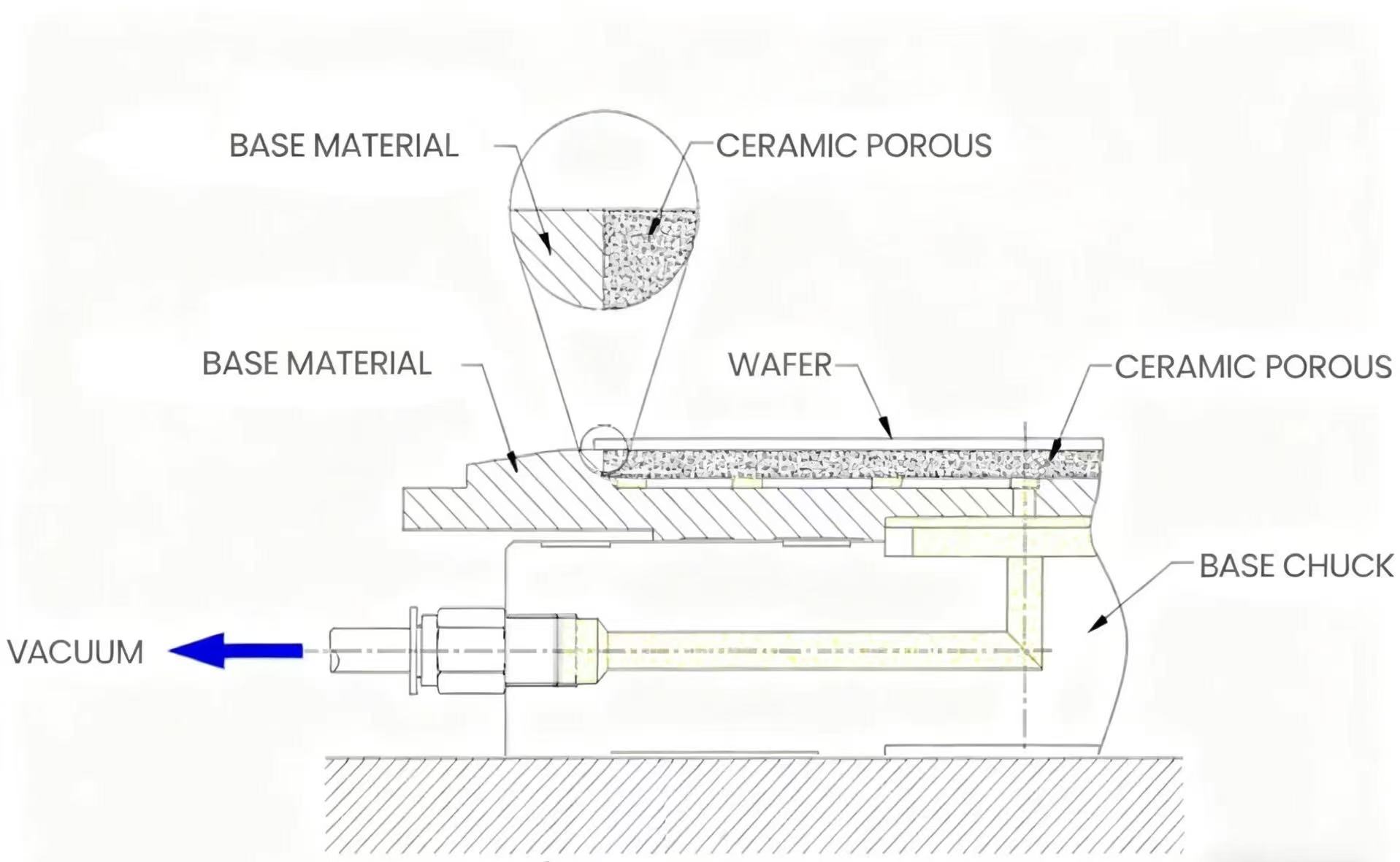 தனிப்பயனாக்கப்பட்டதுநுண்துளை செராமிக் சக்அடித்தளம் மற்றும் நுண்துளை செராமிக் தட்டு ஆகியவற்றைக் கொண்டுள்ளது. ஒரு வெற்றிட அமைப்புடன் இணைத்து, செதில் மற்றும் பீங்கான் இடையே காற்றை வெளியேற்றுவதன் மூலம் குறைந்த அழுத்த சூழல் உருவாக்கப்படுகிறது. வெற்றிட எதிர்மறை அழுத்தத்தின் கீழ், செதில் சக் மேற்பரப்பில் உறுதியாக ஒட்டிக்கொண்டது, இறுதியில் பாதுகாப்பான மற்றும் நிலையான நிர்ணயம் மற்றும் நிலைப்படுத்தலை அடைகிறது.