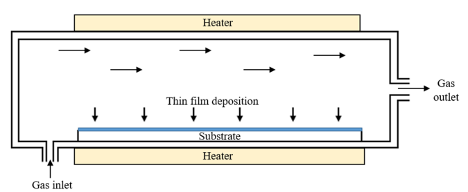1.எதிர்வினை முன்னோடிகள் ஒரு கேரியர் வாயு மூலம் எதிர்வினை அறைக்குள் வழங்கப்படுகின்றன. அடி மூலக்கூறை அடைவதற்கு முன், எதிர்வினை வாயுக்கள் முக்கிய வாயு ஓட்டத்தில் ஒரே மாதிரியான வாயு-கட்ட எதிர்வினைகளுக்கு உட்படலாம், சில இடைநிலை பொருட்கள் மற்றும் கொத்துகளை உருவாக்குகின்றன.