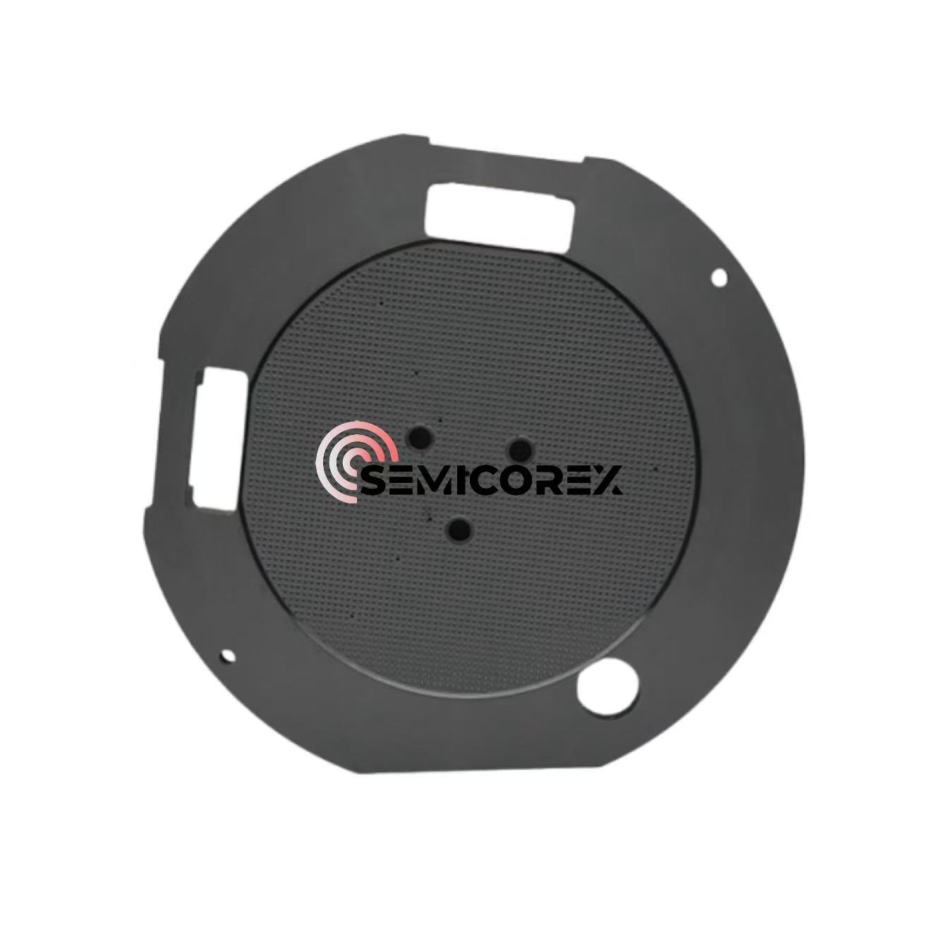 துல்லியமாக வடிவமைக்கப்பட்ட மைக்ரோ-துளைகள் SiC பீங்கான் வெற்றிட சக்ஸின் மேற்பரப்பில் ஒரே மாதிரியாக விநியோகிக்கப்படுகின்றன, இது வெளிப்புற வெற்றிட கருவிகளுடன் நம்பகமான இணைப்பை செயல்படுத்துகிறது. செயல்பாட்டின் போது, துளைகள் வழியாக காற்றை இழுக்க வெற்றிட பம்ப் செயல்படுத்தப்படுகிறது, இது குறைக்கடத்தி செதில் மற்றும் வெற்றிட சக் இடையே எதிர்மறையான அழுத்த சூழலை உருவாக்குகிறது. எனவே, வெற்றிட சக் மேற்பரப்பில் செதில் ஒரே மாதிரியாகவும் உறுதியாகவும் வைத்திருக்க அனுமதிக்கிறது.