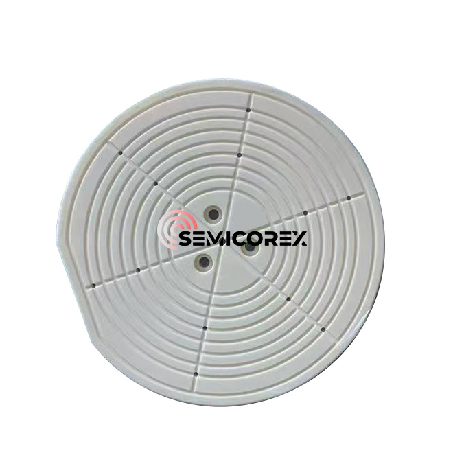 செமிகோரெக்ஸ் வேஃபர் எட்ஜ் அரைக்கும் சக் என்பது செமிகண்டக்டர் உற்பத்தியின் போது செதில் விளிம்பு அரைக்கும் செயல்முறைக்காக தயாரிக்கப்பட்ட ஒரு பிரத்யேக பீங்கான் பகுதியாகும். பீங்கான் அதிக தூய்மை, வெள்ளை அலுமினா (அலோயோ) இயந்திர வலிமை, வேதியியல் எதிர்ப்பு மற்றும் செதில் அரைக்கும் செயல்முறையை ஆதரிப்பதற்கான பரிமாண ஸ்திரத்தன்மை ஆகியவற்றால் ஆனது. புதிய தொழில்நுட்பங்களுக்கு பெரிய செதில் விட்டம் மற்றும் சாதனங்களில் மிகவும் மென்மையான கட்டமைப்புகள் தேவைப்படுவதால், எட்ஜ் சிப்பிங், மைக்ரோ கிராக்கிங் மற்றும் மகசூல் ஆகியவற்றைத் தடுப்பதில் வேஃபர் எட்ஜ் அரைத்தல் இப்போது குறிப்பிடத்தக்க பங்கைக் கொண்டுள்ளது. அலுமினா பீங்கான் அரைக்கும் சக் இந்த கடுமையான உற்பத்தித் தேவைகளைப் பூர்த்தி செய்ய ஒரு நிலையான அடிப்படையை வழங்குகிறது.